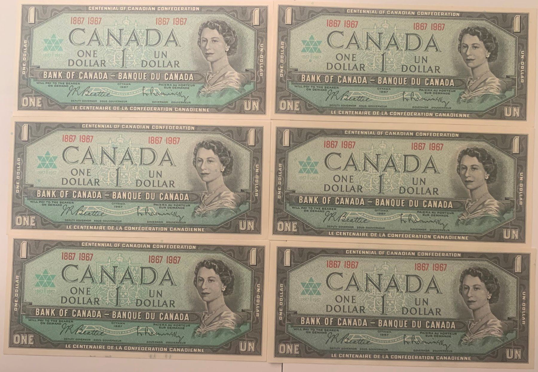 Lot of 6 Canada 1 Dollar 1967 Bank of Canada $1 Asterisk Serial Number UNC Uncirculated