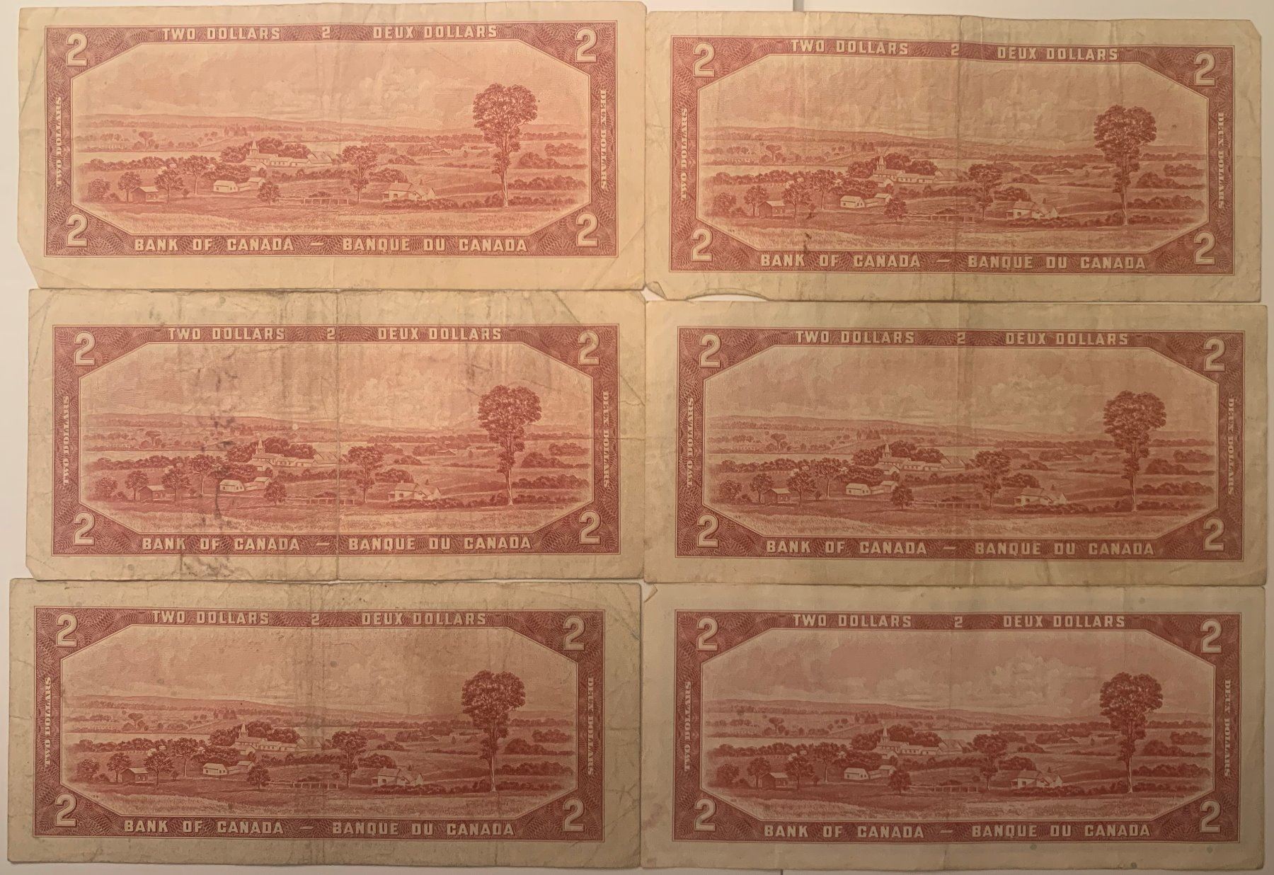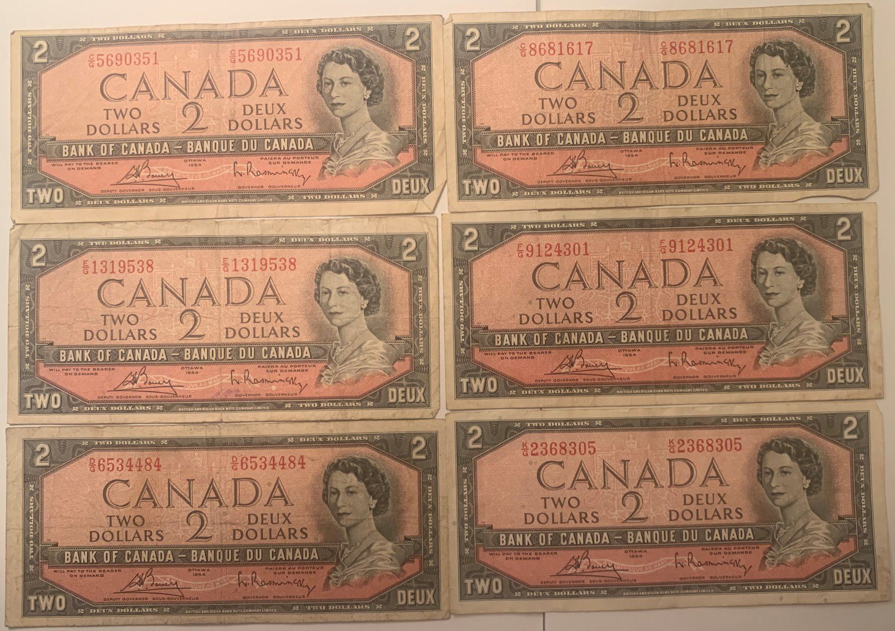 Lot of 6 Canada 2 Dollar 1954 Bank of Canada $2 Circulated Modified Portrait