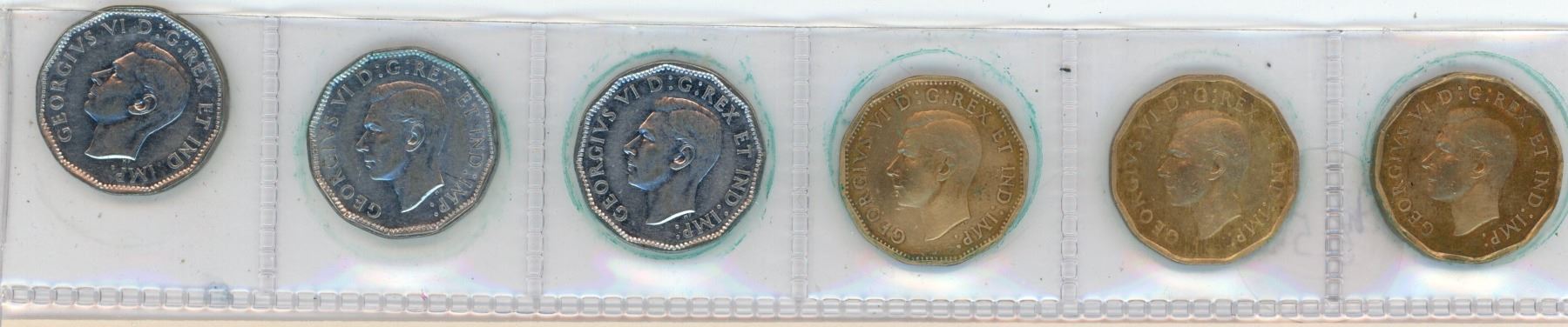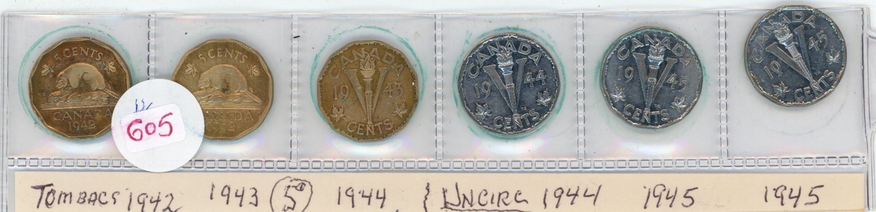 Lot of 6 Canadian 5 cent coins 3/tombacs-1942-44, 3 "V" 1944 and 2-1945