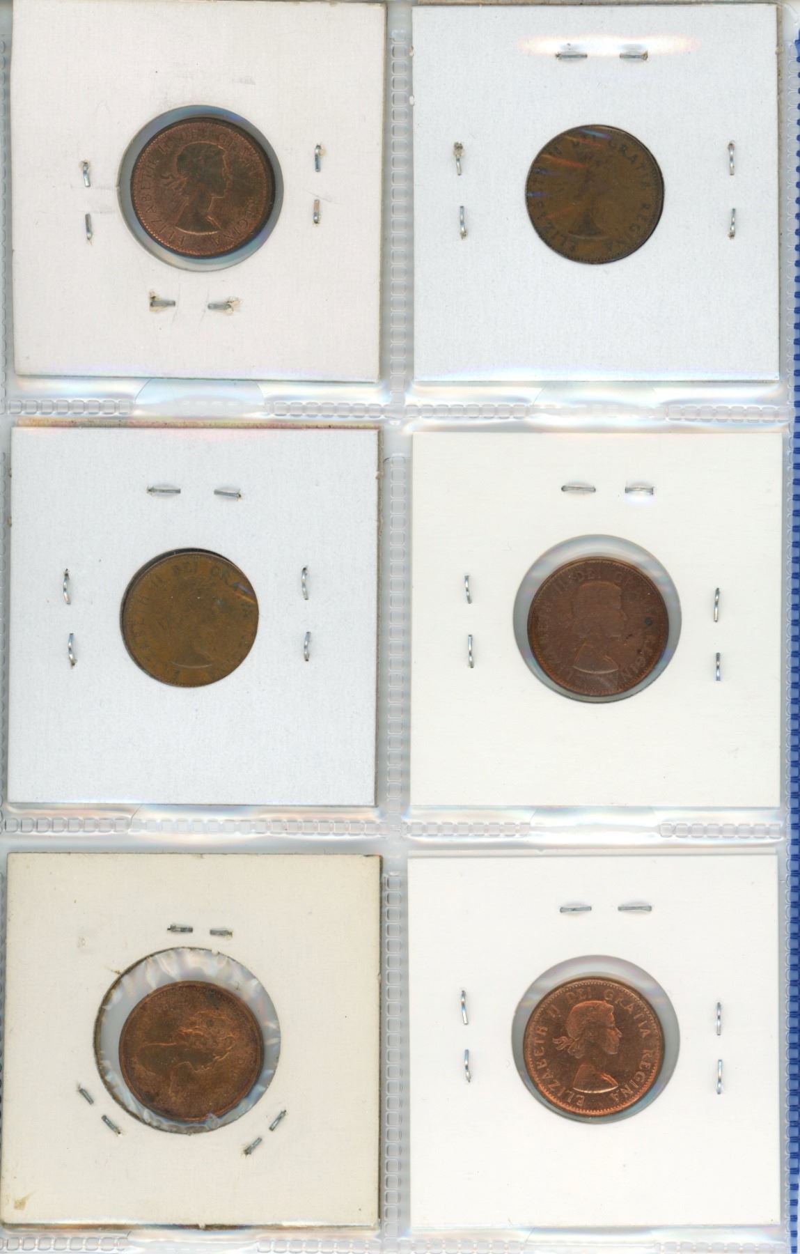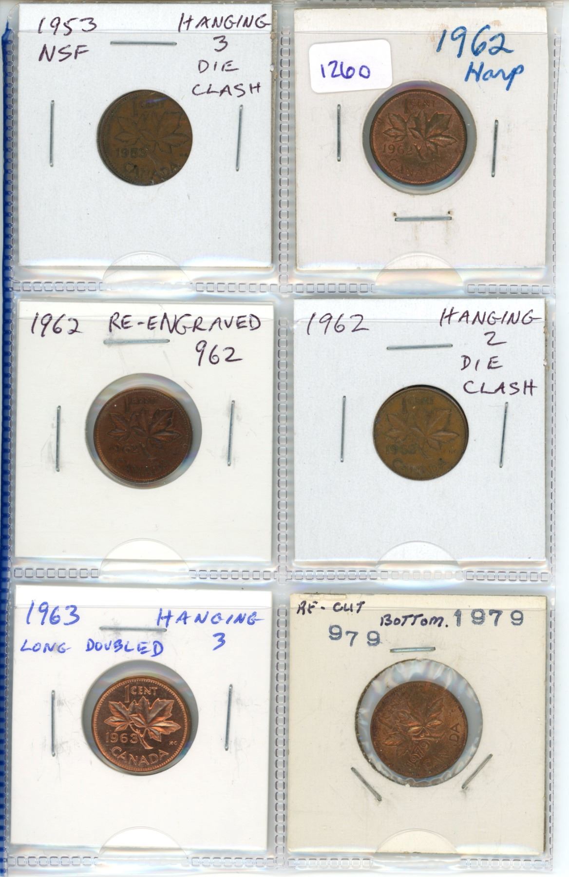 Lot of 6 Canadian Small Cent Errors & Varieties. Includes Hanging Dates from Die Clashes, Harp, Re-Engraved Date, & Recut Date.