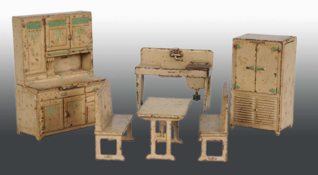 Includes cupboard with cabinet doors that open, refrigerator marked "Frigid Air" on front with rubber stamping, two benches, a table and sink marked "Kohler" with rubber stamp on front. Some still retain the Arcade stickers on back or bottom of pieces. Moderate overall chipping and wear. Cast Iron Toys Condition (Good - Very Good). Size Largest: 8" T.