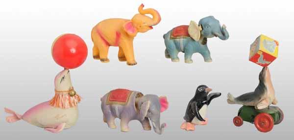 Description Working. Includes on seal balancing a box on its nose, three elephants, one penguin on tin base, and one seal with ball. Condition (Very Good). Size All: 5" T.
