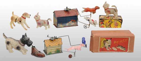 Description Japanese. Working. All toys marked "Made in Japan". Includes three original boxes, one for dog chasing cat with fish toy. One Original Box has been ADDDED to this lot. Condition (Very Good - Excellent). Size Largest: 6" L.