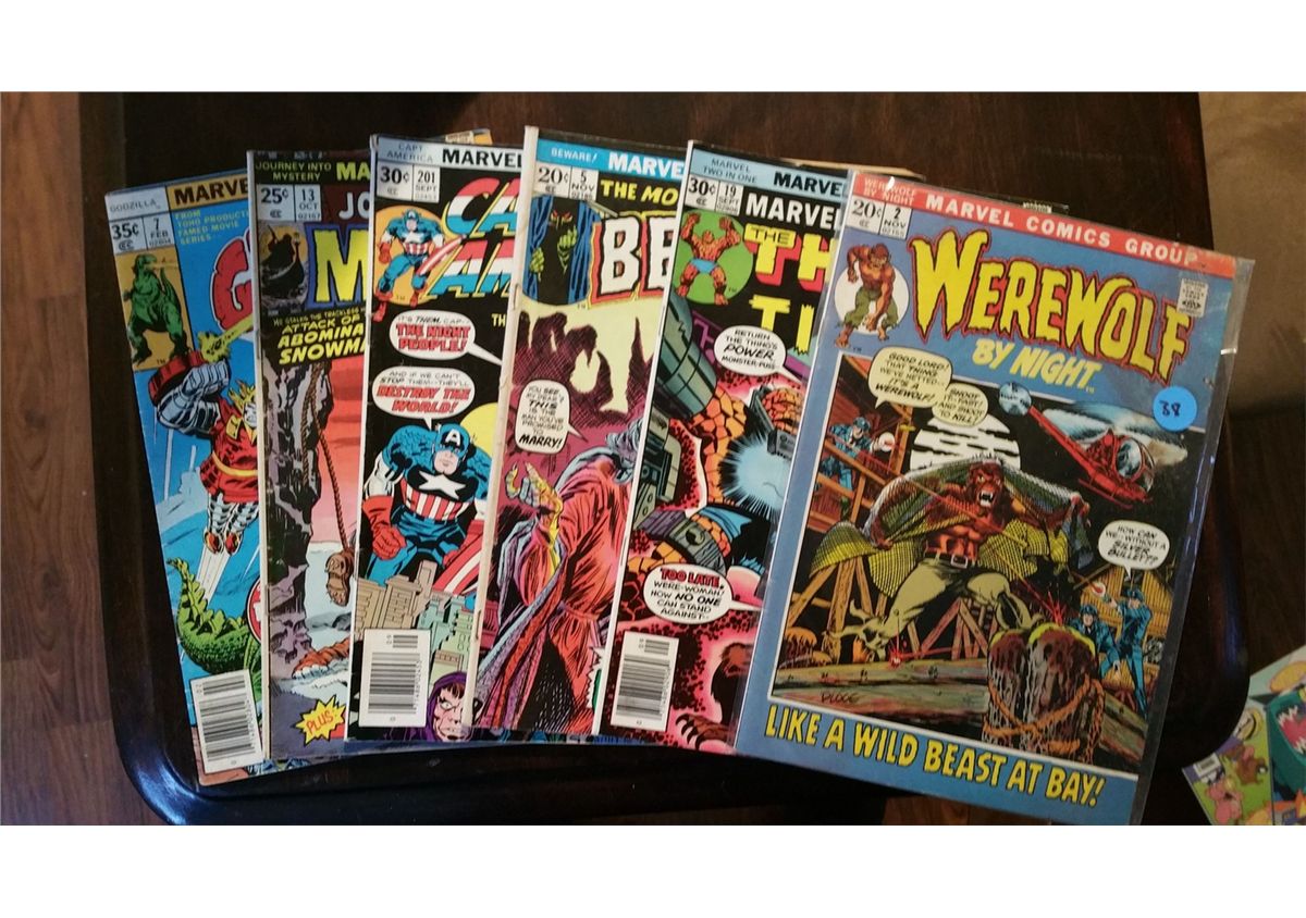 Here we have (6) comics, werewolf #2, the thing and tigra #19, the monsters are coming - beware #5, captain america and the falcon #201, journey into mystery #13, godzilla king of the monsters #7, all showing wear & tear.