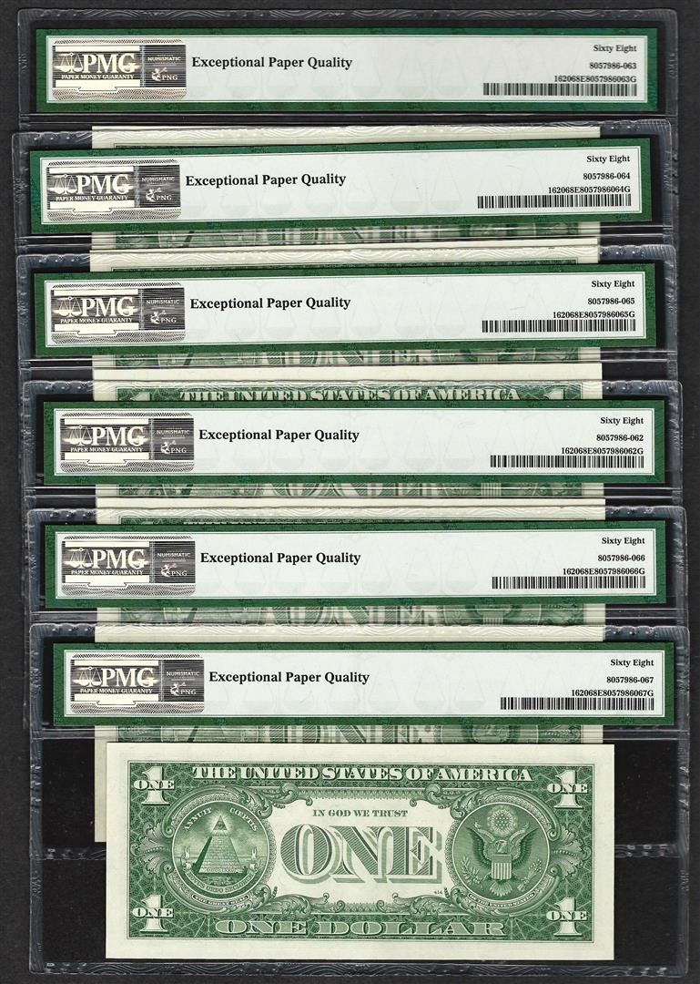 One Lot of (6) Consecutive 1957A $1 Silver Certificate Notes PMG Superb Gem Unc. 68EPQ. PMG Certified.