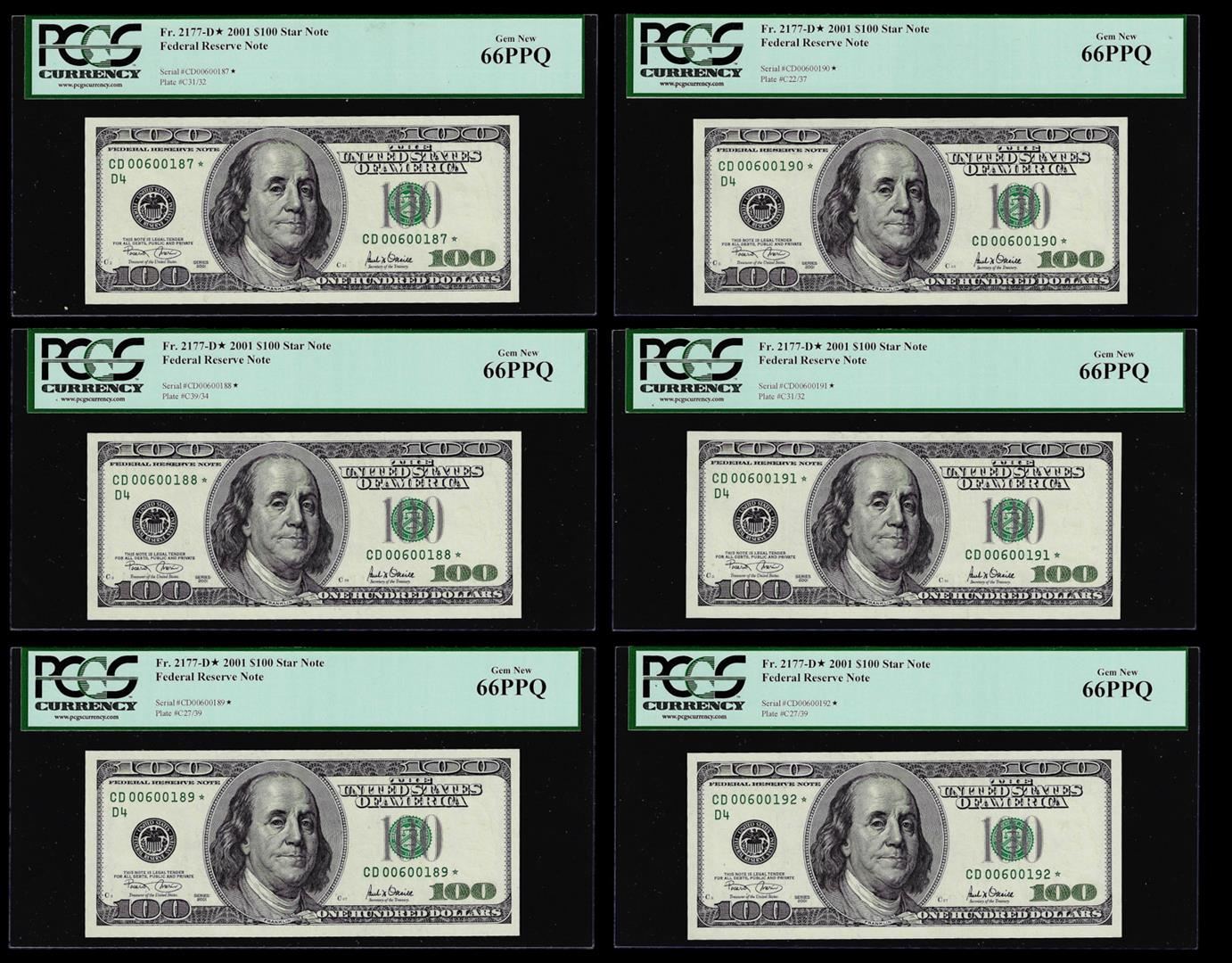One Lot of (6) Consecutive 2001 $100 Federal Reserve STAR Notes PCGS Gem New 66PPQ. PCGS Graded.