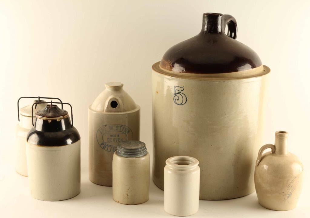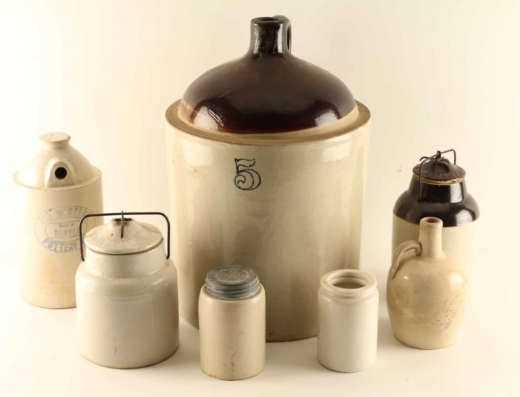 Including; (2) Western Stoneware crocks with lids and wire closure, (1) jug with 'W. Harper', (1) 'The Western Made in Denver CO' (1) small 'James Keiller & Sons Marmalade' (1) small crock with metal Ball lid. Sizes range from 10 1/4"h x 5 1/4" dia to 4 3/4"h x 3 1/4"dia. All are in good condition.