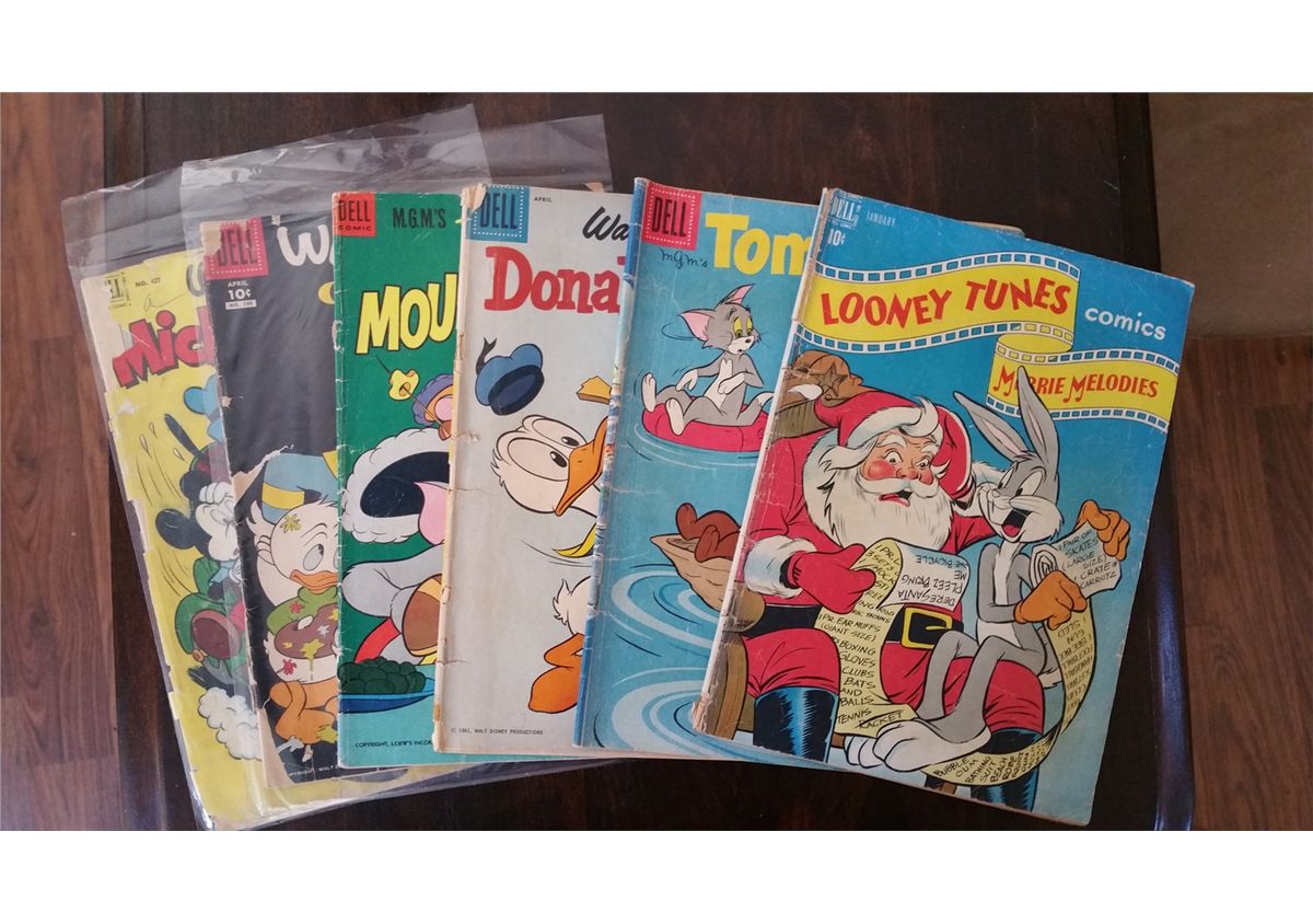 Lot of (6) Dell .10 Cent comics, mickey mouse #427, walt disney comics and stories #199, looney tunes, tom & jerry, donald duck, the two museketeers #145 - all showing wear & tear.