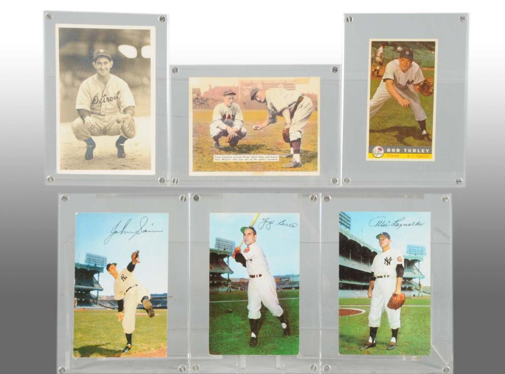 Earliest is a card showing Hall of Famer Honus Wagner as a coach teaching Floyd Vaughn how to play shortstop. Others include a 1930s autographed card of Detroit Tiger's catcher Mickey Cochrane which has been removed from a book that it was glued too, three New York Yankees 1950s postcards and a 1950s picture card of Yankee pitcher Bob Turley. Baseball Cards Condition (Very Good). Size All: 4" x 6".