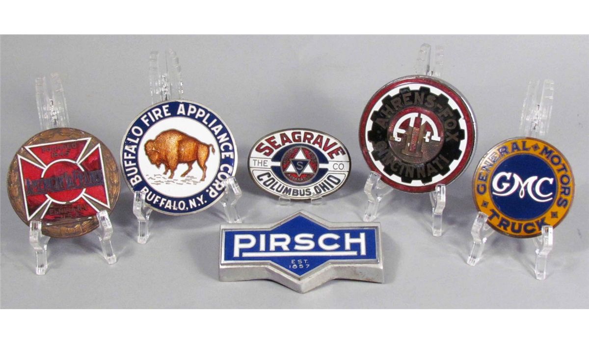 Lot of 6 Enameled Shields including American-LaFrance, Seagrave, Ahrens-Fox, Buffalo Fire Appliance, Piersch and GMC Truck.
