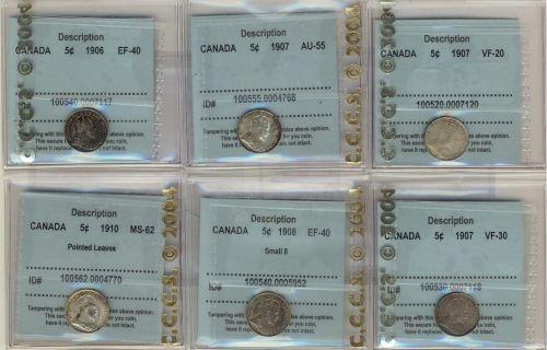 Lot of 6 Five cents silver, all CCCS graded, includes 1906 EF40, 1907 AU55, VF20 and VF30, 1908 Sm.8 EF40 and 1910PL MS60.