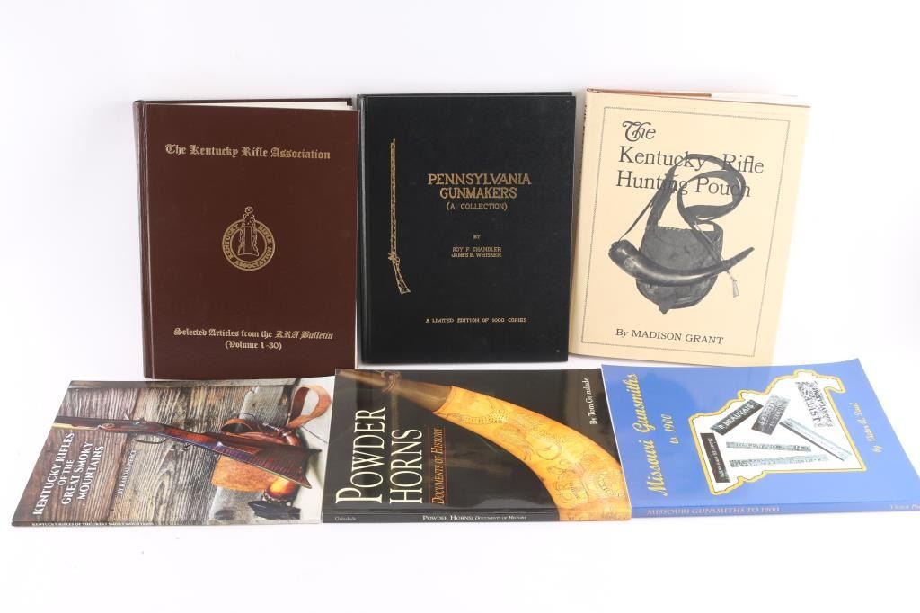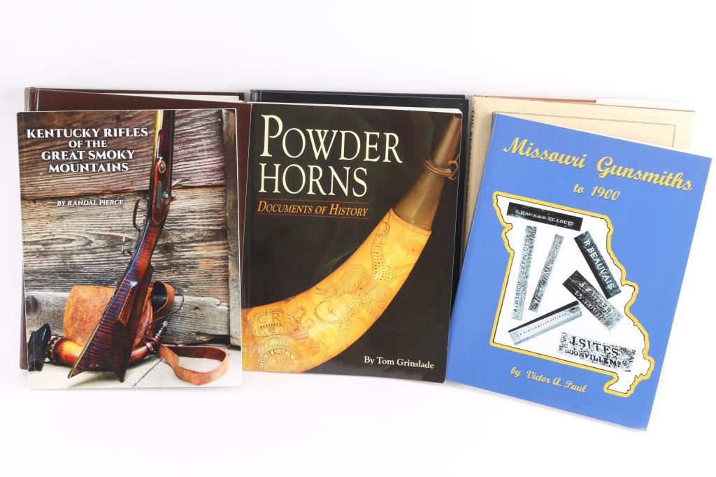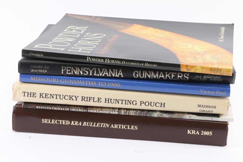 Includes: Missouri Gunsmiths to 1900 by Victor A. Paul; Pennsylvania Gunmakers, a collection (Limited Ed.) by Roy F. Chandler and James B. Whisker; The Kentucky Rifle Hunting Pouch by Madison Grant; Kentucky Rifles of the Great Smoky Mountains (Limited Ed. No. #42 of 75) and signed by the author Randal Pierce; Powder Horns Documents of History by Tom Grinslade; The Kentucky Rifle Association, Selected Articles from the KRA Bulletin Vol. 1-30.