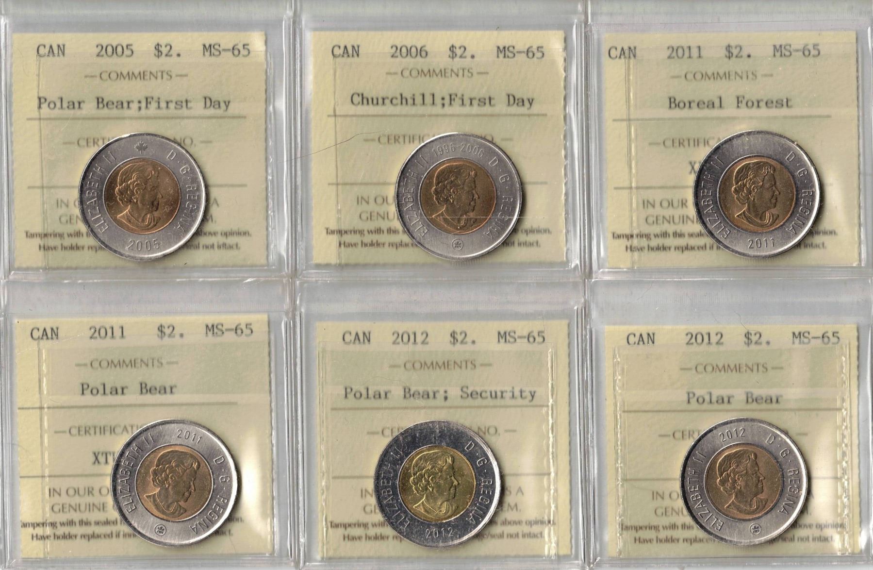 2005 $2 Polar Bear; First Day MS-65, 2006 $2 Churchil; First Day MS-65, 2011 $2 Boreal Forest; First Day MS-65, 2011 $2 Polar Bear MS-65, 2012 $2 Polar Bear; Security MS-65, 2012 $2 Polar Bear MS-65, All ICCS Graded