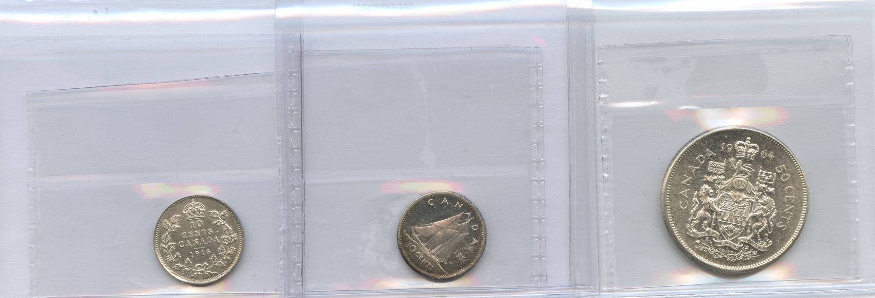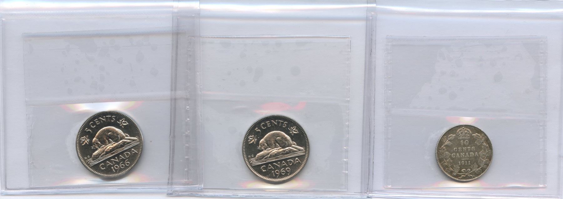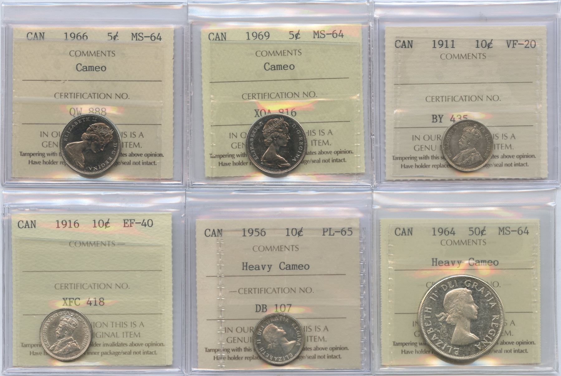 Includes: 1966 Five Cents MS-64, Cameo. 1969 Five Cents MS64, Cameo. 1911 Ten Cents VF-20. 1916 Ten Cents EF-40. 1956 Ten Cents PL-65, Heavy Cameo. 1964 Fifty Cents MS-64, Heavy Cameo. 6 Pcs.
