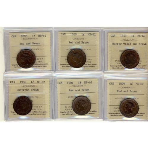 Lot of 6 ICCS graded MS-62RB Large Cents; 1859 N.9, 1888, 1895, 1899, 1901, 1906. All with red luster