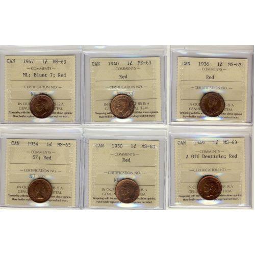 Lot of 6 ICCS graded MS-63Red; 1936, 1940, 1947 ML Blunt, 1949 A off, 1950, 1954 SF