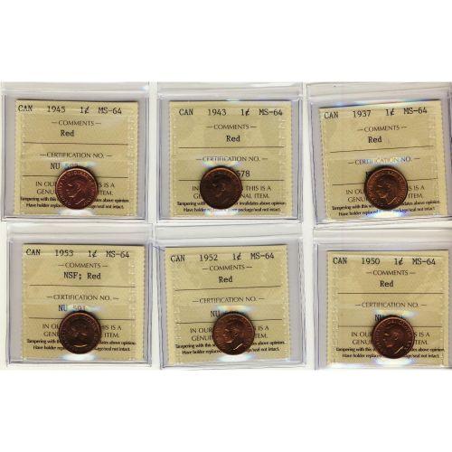 Lot of 6 ICCS graded MS-64Red; 1937, 1943, 19