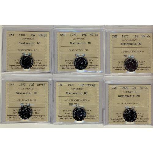 Lot of 6 ICCS graded MS-66 10¢ "NUMISMATIC BU"; 1977, 1979, 1982, 1990, 1991, 1993