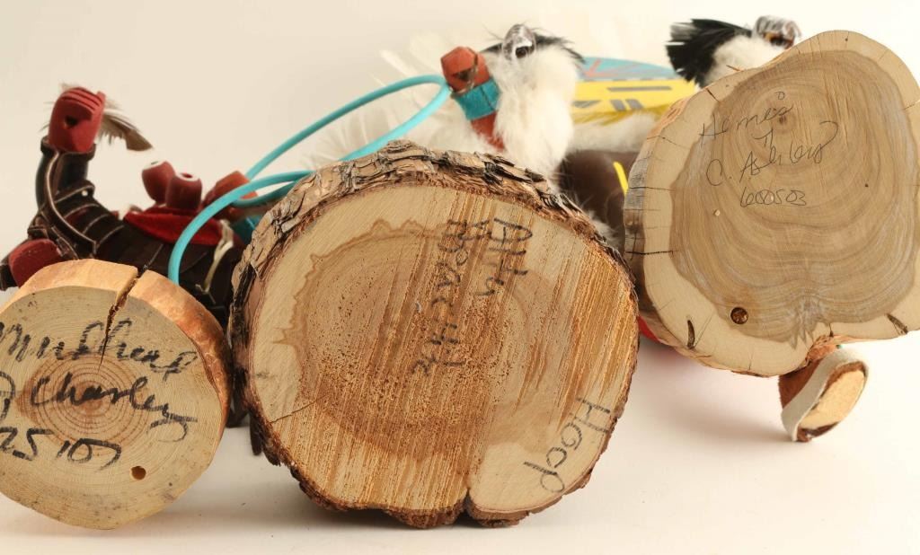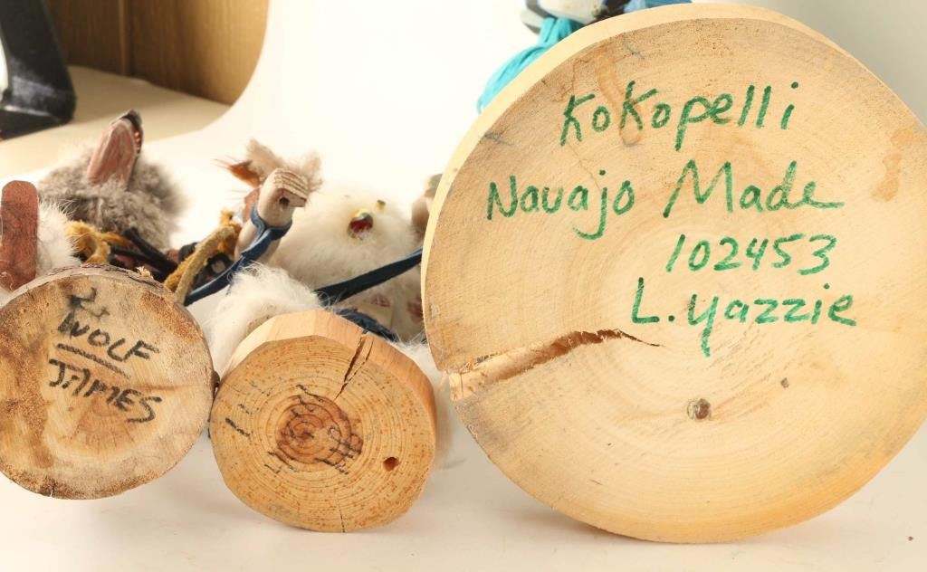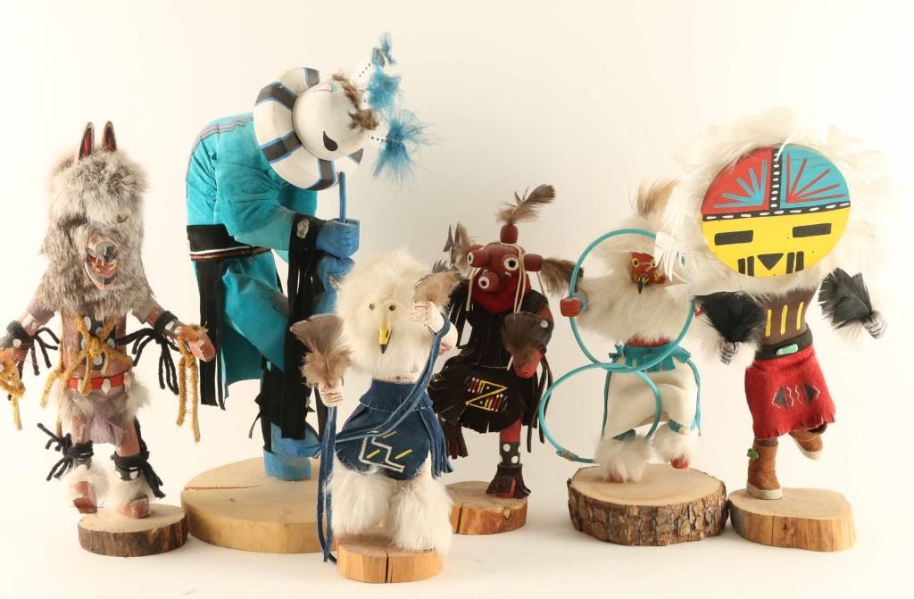 Including; Sunface Kachina with removable mask, Kokopelli, Mudhead, Wolf, Hoop Dancer and Bird Kachina. All are wood carved and hand painted with, fur, feather, stone, shell and leather accents. Some pieces missing, overall good condition.