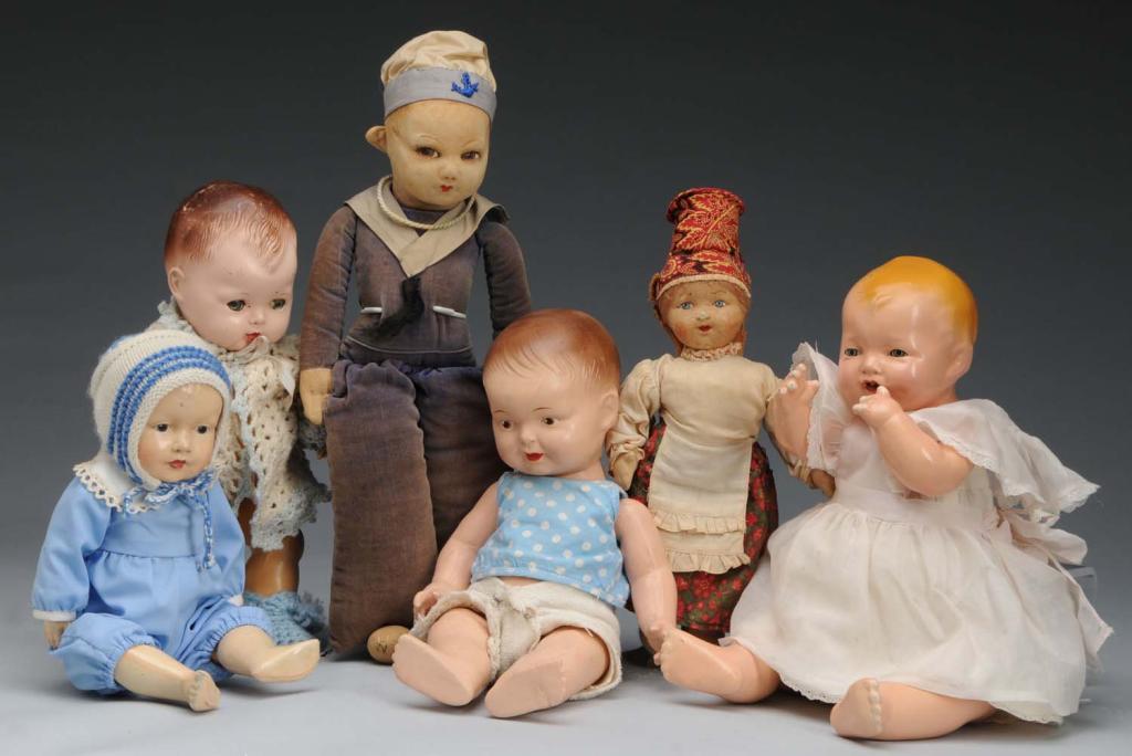 Description Largest is a cloth sailor doll, possibly by Norah Wellings. Also includes an Effanbee baby, three other babies, and a Russian cloth doll. Condition (Fair - Good).