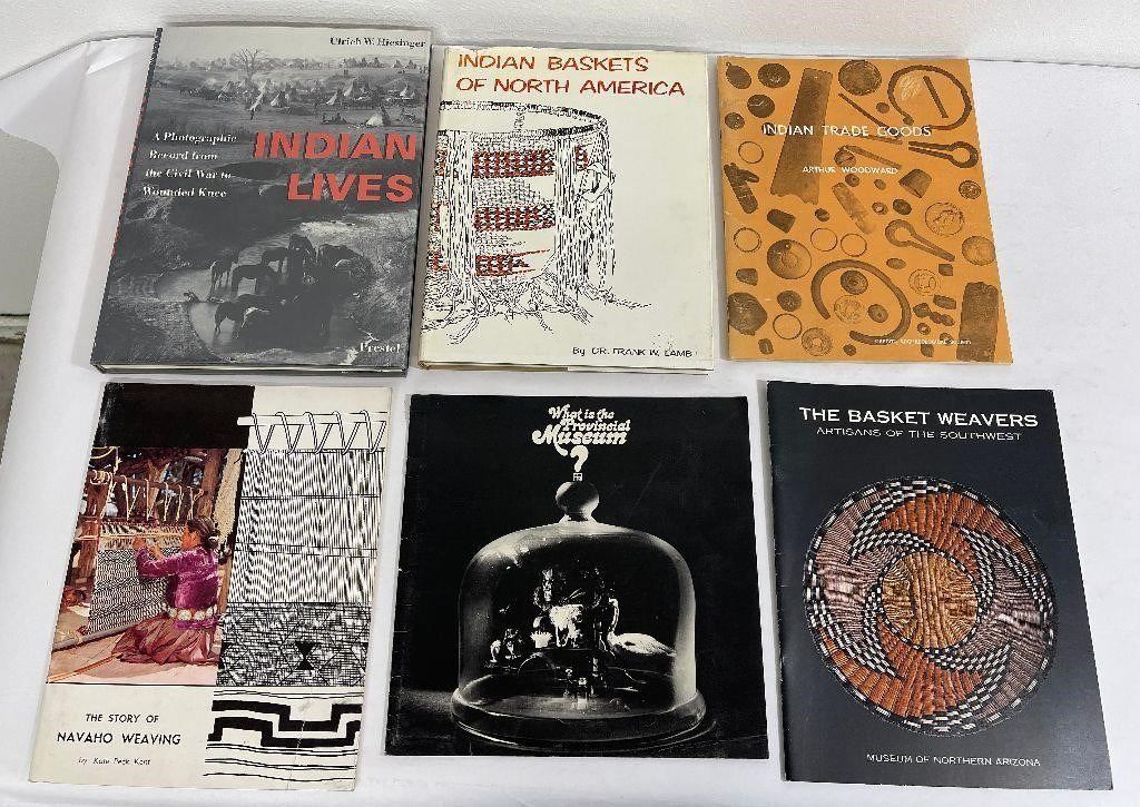 Nice lot of books. Titles include, Indian Lives, Indian Basket of North America, Indian Trade Goods, The Story of Navaho Weaving, What is the Provincial Museum, The Basket Weaver of the Southwest. Bob Borcherdt collection. Bigfork, Montana