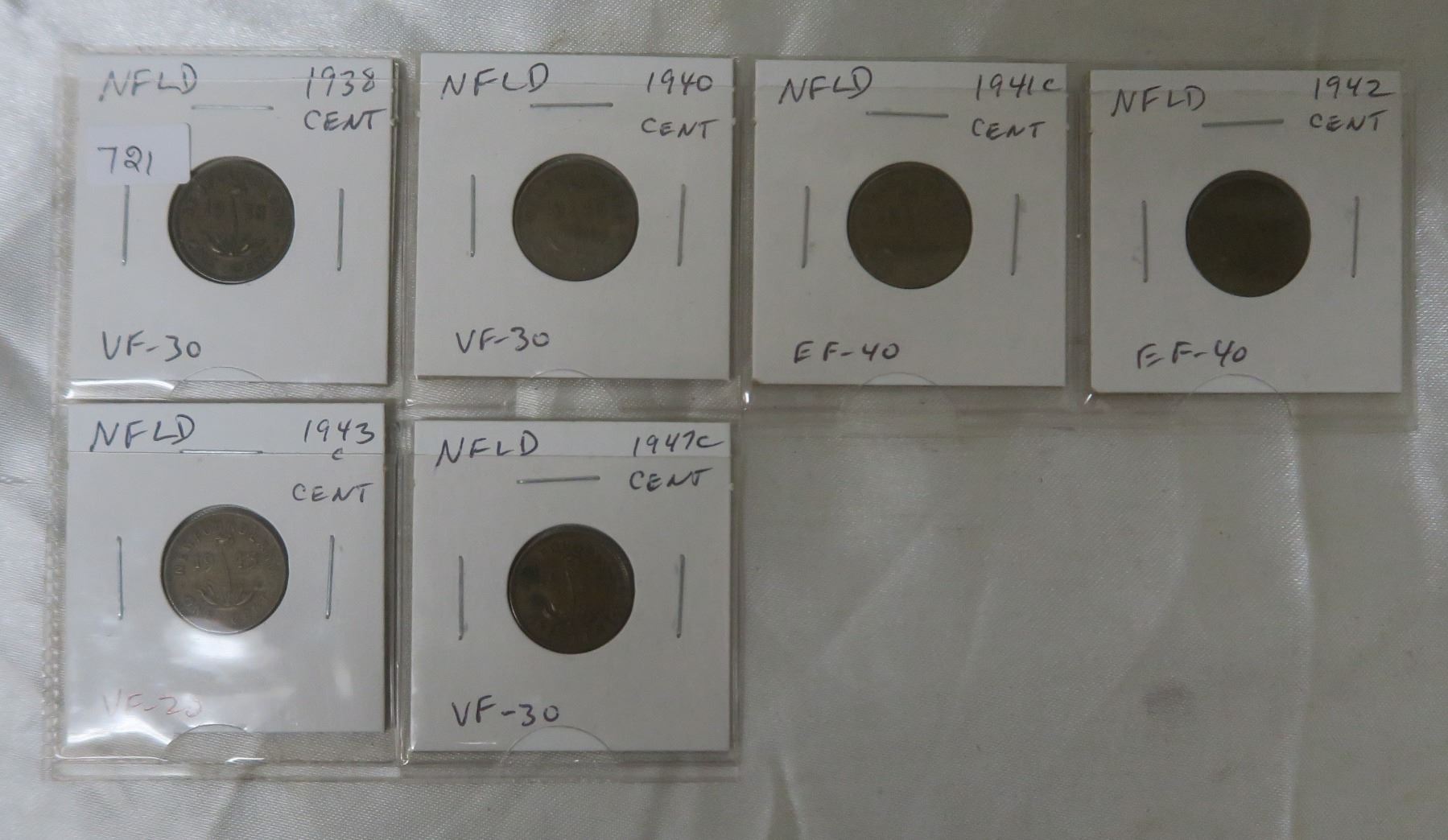 Lot of 6 Newfoundland Small Cents. Includes 1938, 1940, 1941c, 1942, 1943c & 1947c. Coins grade VF-20 to EF-40.