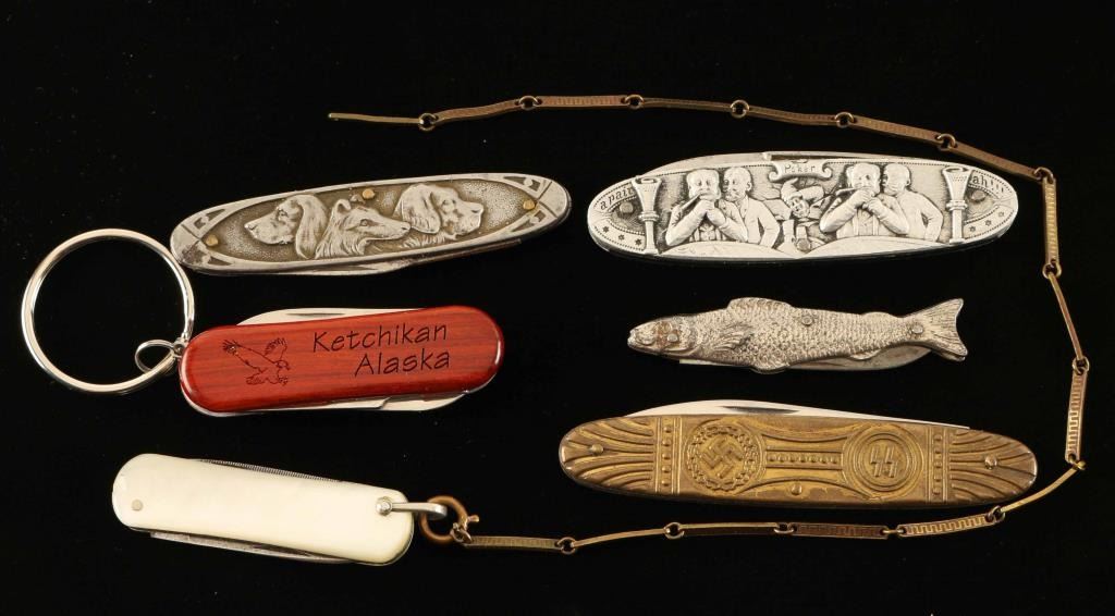Including; Nazi Deutschland Erwacht, Ketchican, AK, fish shaped knife, abalone with chain, Full Hand poker knife and Solingen with horses and dogs. Eclectic collection.