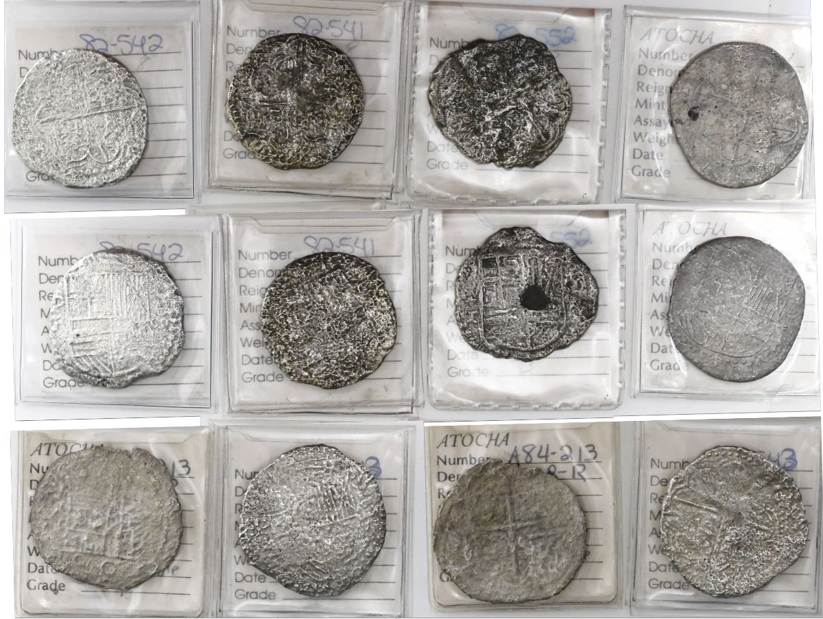 Lot of 6 Potosi, Bolivia, cob 8 reales, Philip III, assayers R, Q, T and not visible, all Grade 3, old certificates (pre-"mother lode"). KM-10. 101.53 grams total. Moderately to heavily corroded, most with clear shields and crosses, but mostly attractive for the old tags and certificates. With Fisher photo-certificates #82-541, 82-542, 82-543, 82-552, A84-001 and A84-213. Recovered from: Atocha, sunk in 1622 west of Key West, Florida