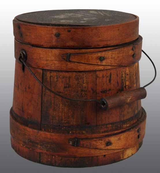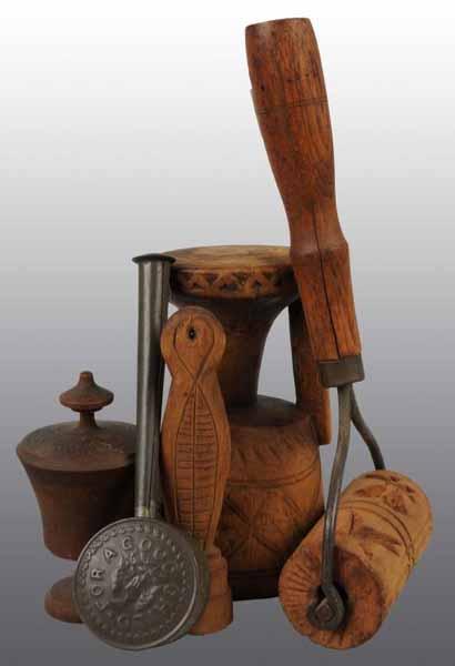 Description Five are wooden Treen Ware and one is a metal child's rattle. Includes one butter print, one wooden bucket, one wooden mortar, a lidded compote and a hand butter print. Condition (Excellent). Size Largest: 7" T.