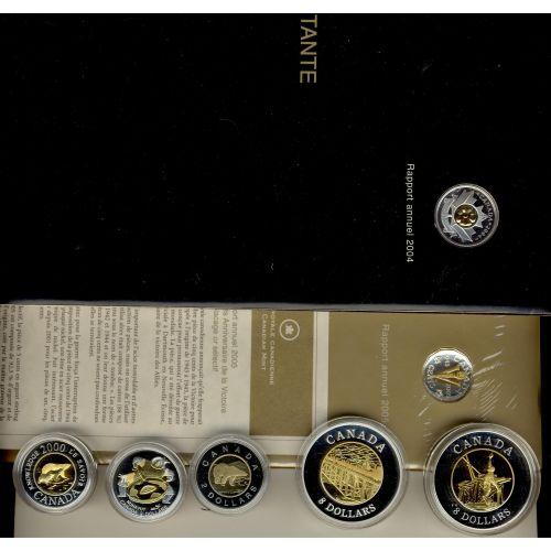 Lot of 6 RCM coins, includes, 2004 Annual Report 25¢ silver poppy w/gold plate, 2005 Annual Report 5¢1945-2005 in sterling w/gold plate, 2005 Comm of chinese railway Workers set (2 x $8,00), 1996 $2 Proof, 1999 $2 Nunavut in sterling silver, 2000 $2 (3