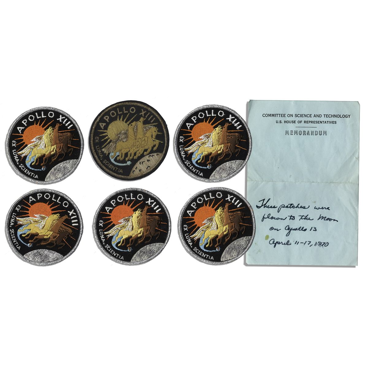 Lot of 6 official patches flown in space on the near-disastrous Apollo 13 mission in 1970. Round patches are embroidered with mission slogan ''Ex Luna, Scienta'', meaning ''from the moon, knowledge'' surrounding dynamic mission insignia: a trio of horses galloping over the moon. Five are identical, with embroidery in orange, yellow, brown, black, white and blue with sparkly silver border. The remaining patch is the same design but crafted in muted earth tones. Accompanied by a handwritten authenticity note in Swigert's hand on U.S. House of Representatives Committee on Science and Technology letterhead. Each patch measures just over 4'' in diameter. Fine. From Jack Swigert's estate.