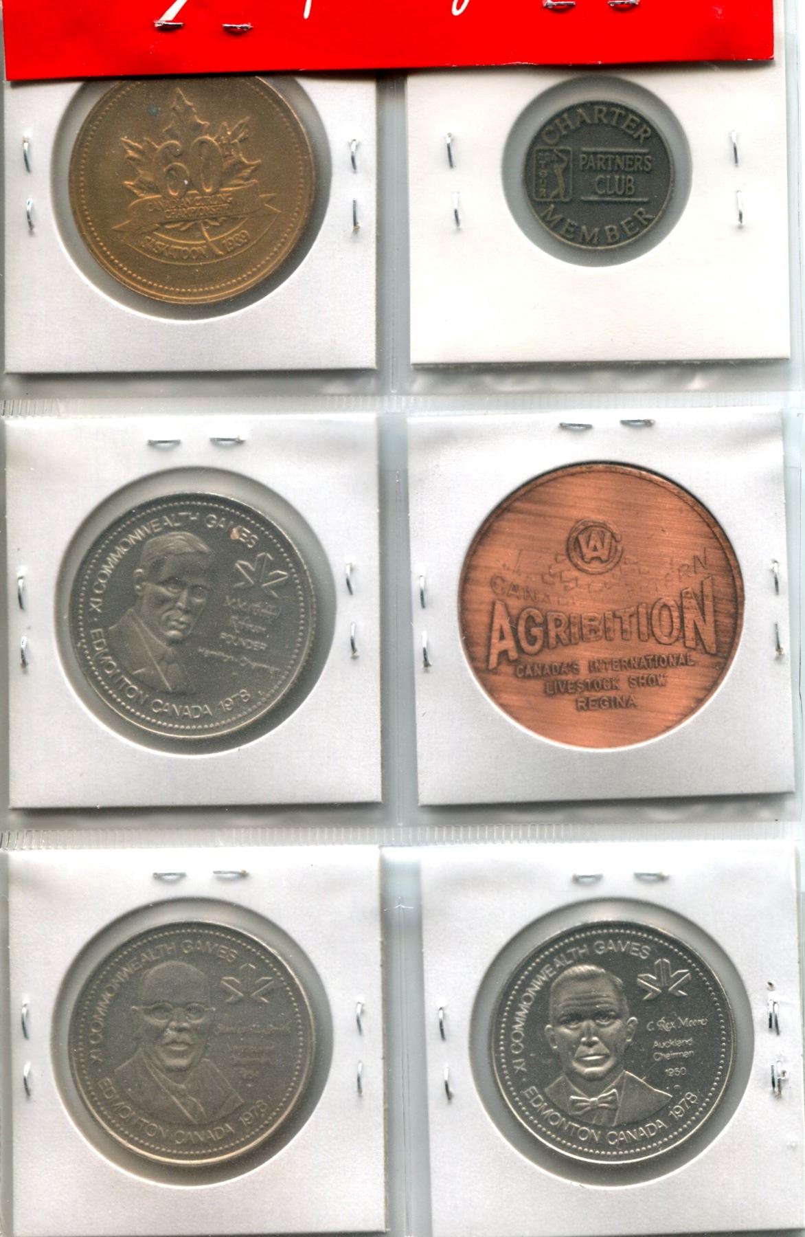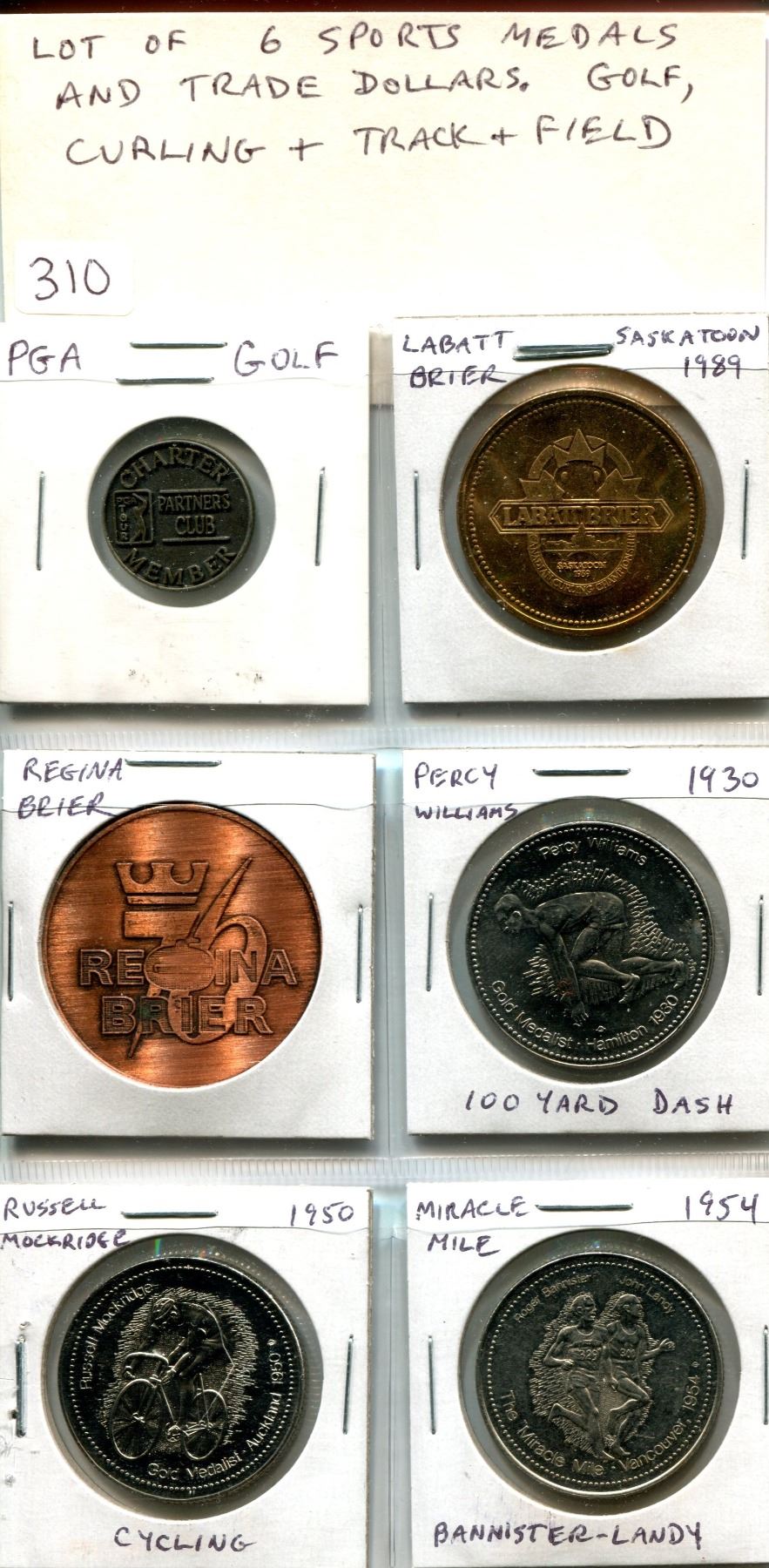Lot of 6 Sports Medals & Trade Dollars. Includes PGA golf, 2 Brier Curling, and 3 track and field.