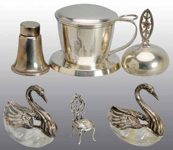 Description Includes one dinner bell, one tea caddy, one doll-size Victorian chair, one weighted shaker, and one pair of crystal swan salts. Condition (Excellent). Size Dinner Bell: 3" T.