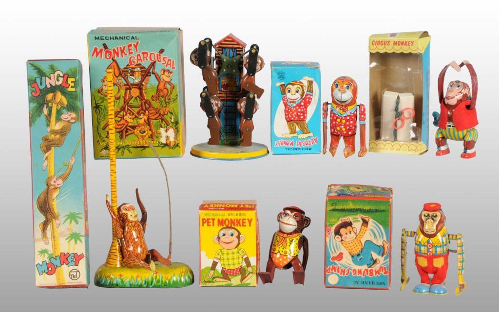Description Japanese. Post-war. Working. One marked "TPS", one monkey carousel, one jungle monkey with tree, and four walking somersault monkeys. Includes original boxes. Condition (Excellent). Size Largest: 12" T.