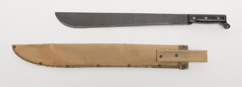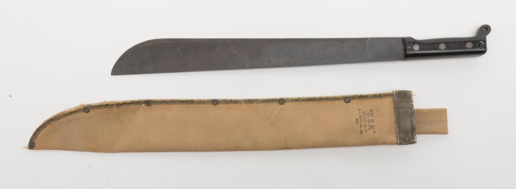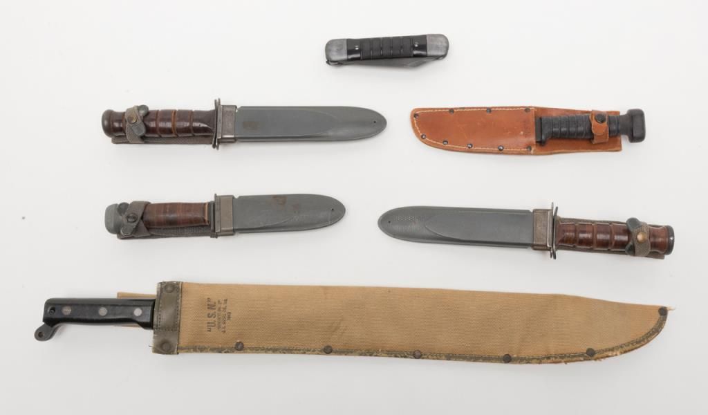 Lot of 6 U.S.N. knives including two MK 1s with sheaths, two MK 2s with sheaths, a folder and a machete with a canvas sheath; a neat U.S. Naval lot! Est.: $350-$700.