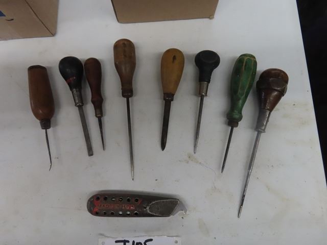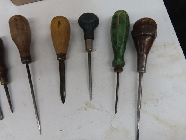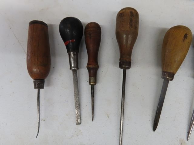 Lot of 6 Vintage Antique Awls plus a small wood chisel and knife for leather or wood working. They are of various models and sizes. The only makers mark is on the knife which is a Defiance 289.