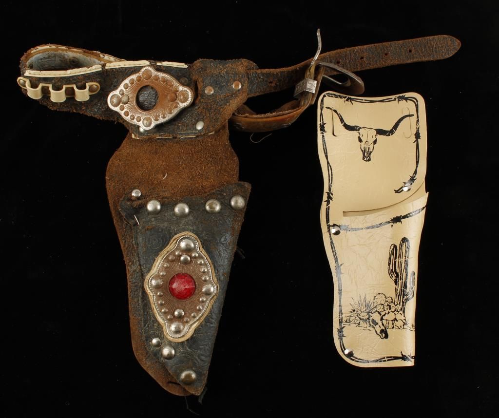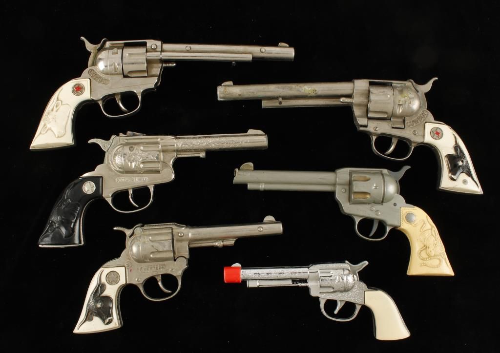(2) Hubley "Cowboy" cap guns with steers head grips. The barrel is loose on (1), the other is in working condition. (1) Hubley "Ric-O-Shay" cap gun with steers head grips. There is some corrosion to the hammer area and the trigger is stiff. (1) Cap gun marked "Western" with steers head grips. Also includes (2) plastic toy guns. (1) toy belt holster, and (1) toy single holster rig in poor condition.