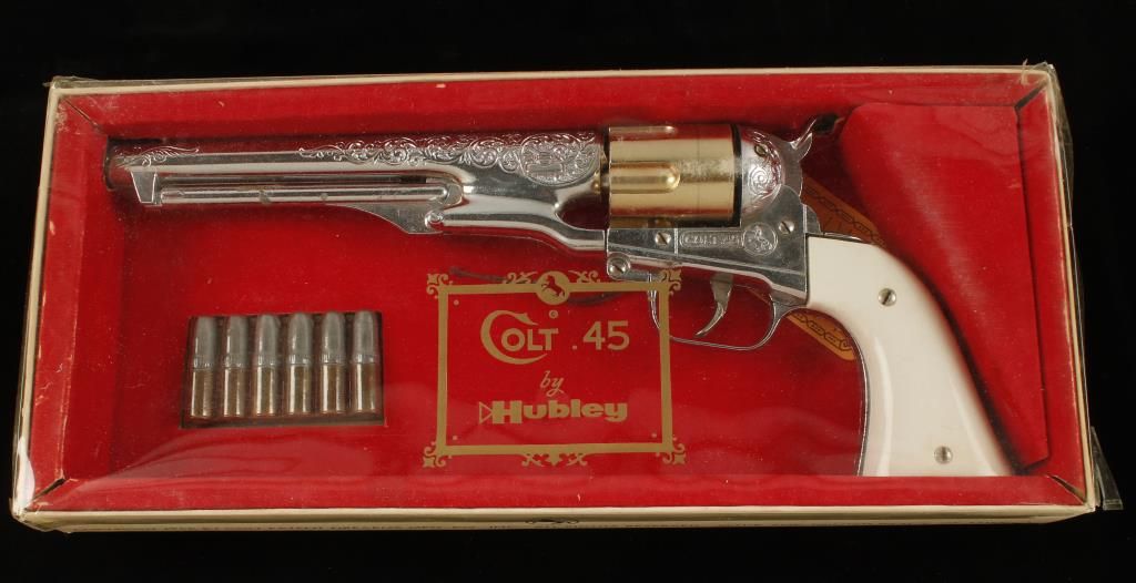 All are the Colt .45 repeating cap pistol. In various conditions. (1) Is in the original box which is dated 1958. Also includes the original metal "cartridges".
