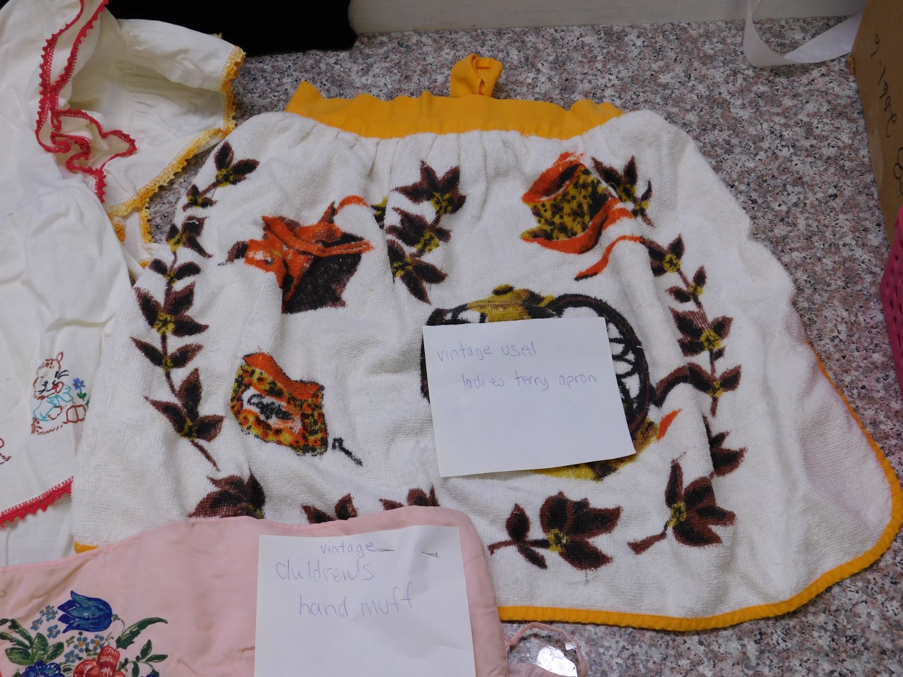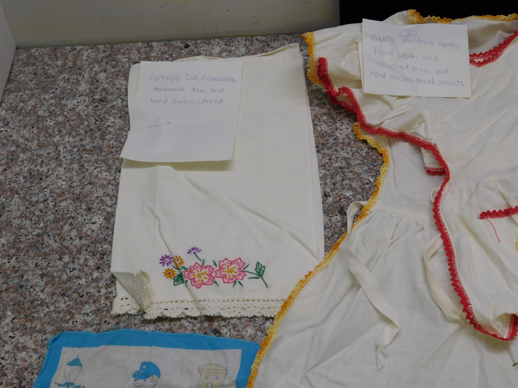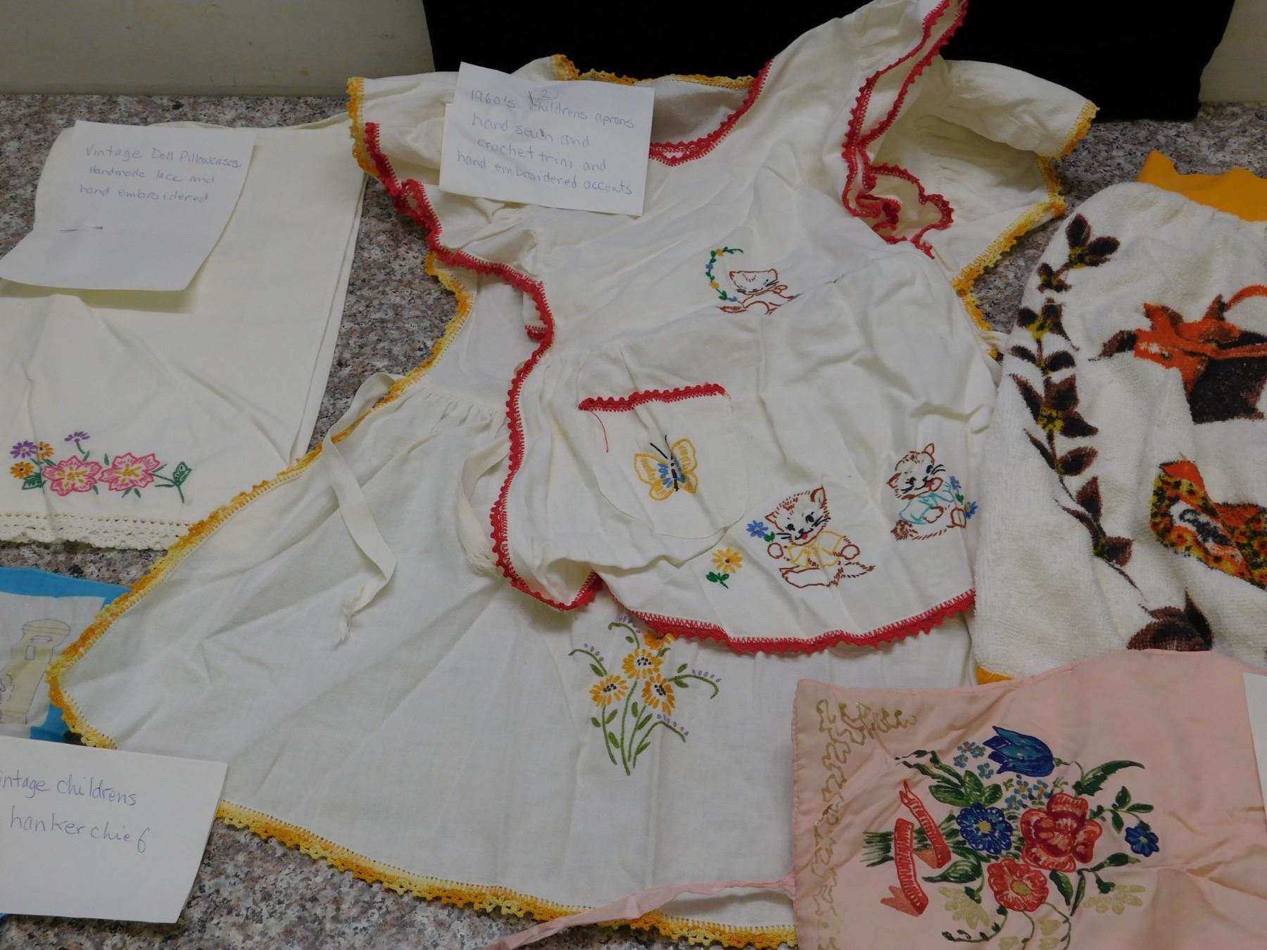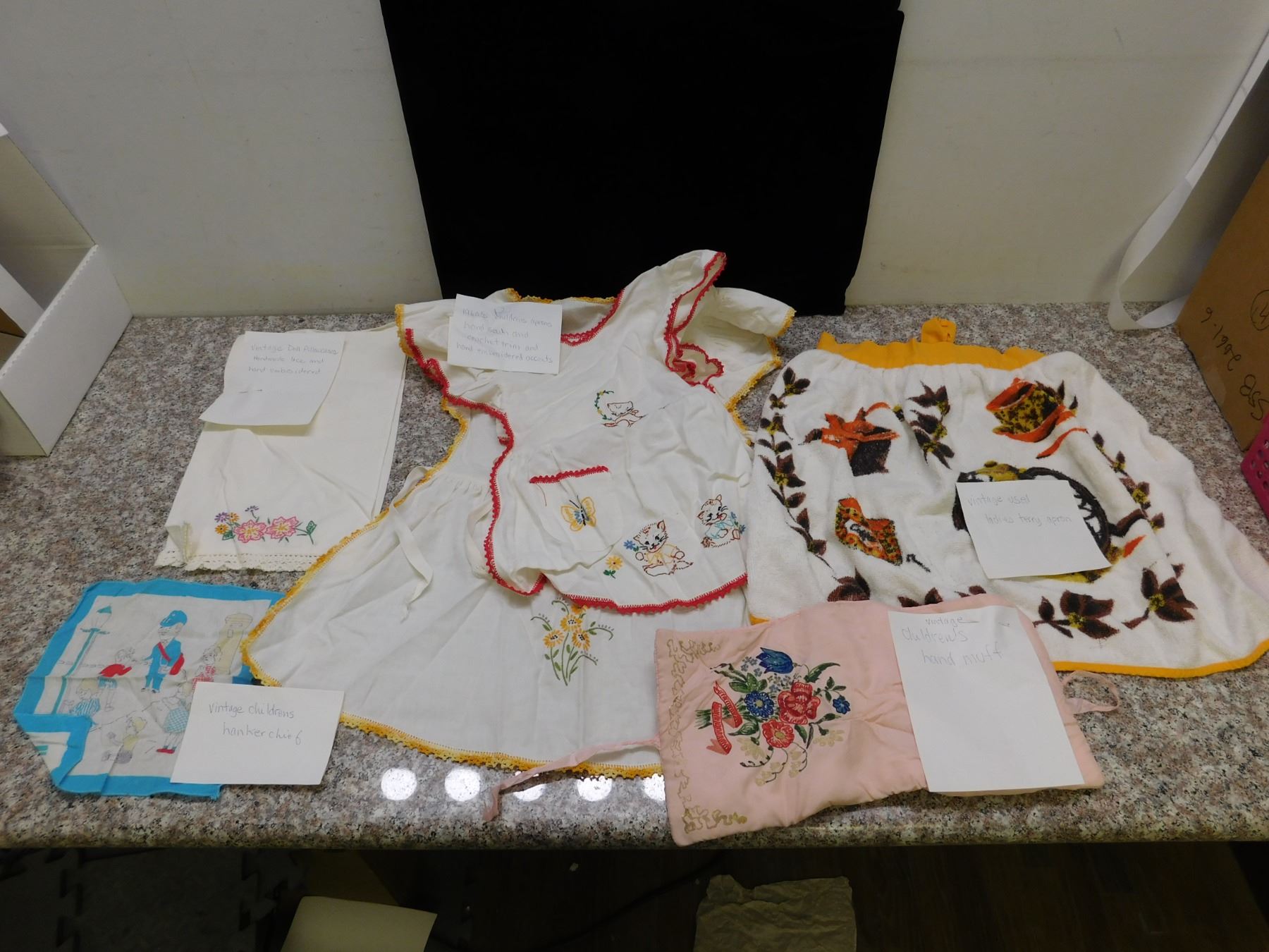 hand embroidered doll pillowcases. two hand sewn children's aprons, a used terry apron and a small kids handkerchief, children's hand muff.
