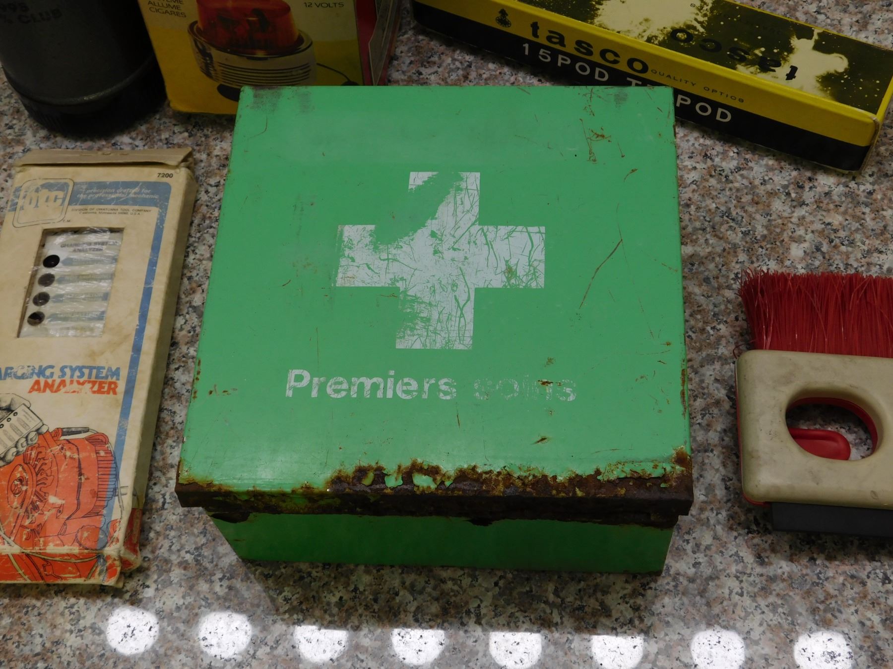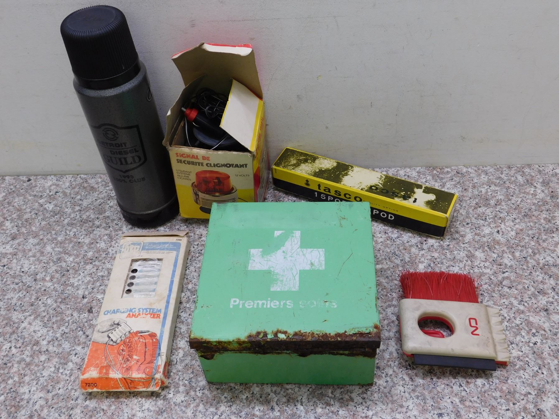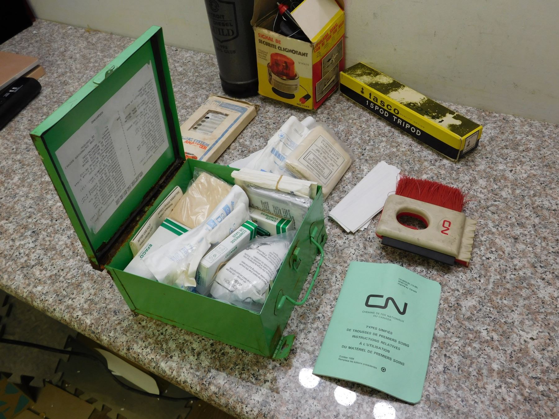 Lot of 6 Vintage Travel Survival Kit CN Rail Brush, Tripod, First Aid, Thermos, Revolving Signal, +