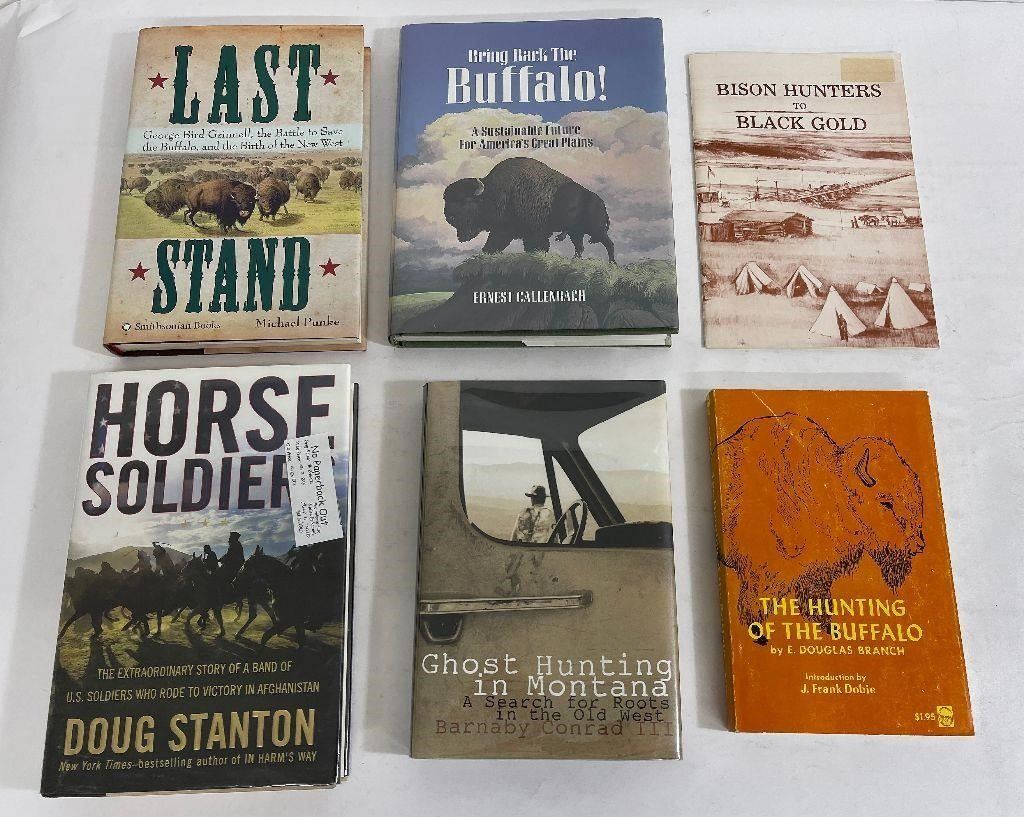 Nice lot of books. Titles include, Last Stand, Bring Back the Buffalo, Bison Hunters to Black Gold, Horse Soldier, Ghost Hunting in Montana, The Hunting of the Buffalo. Bob Borcherdt collection. Bigfork, Montana