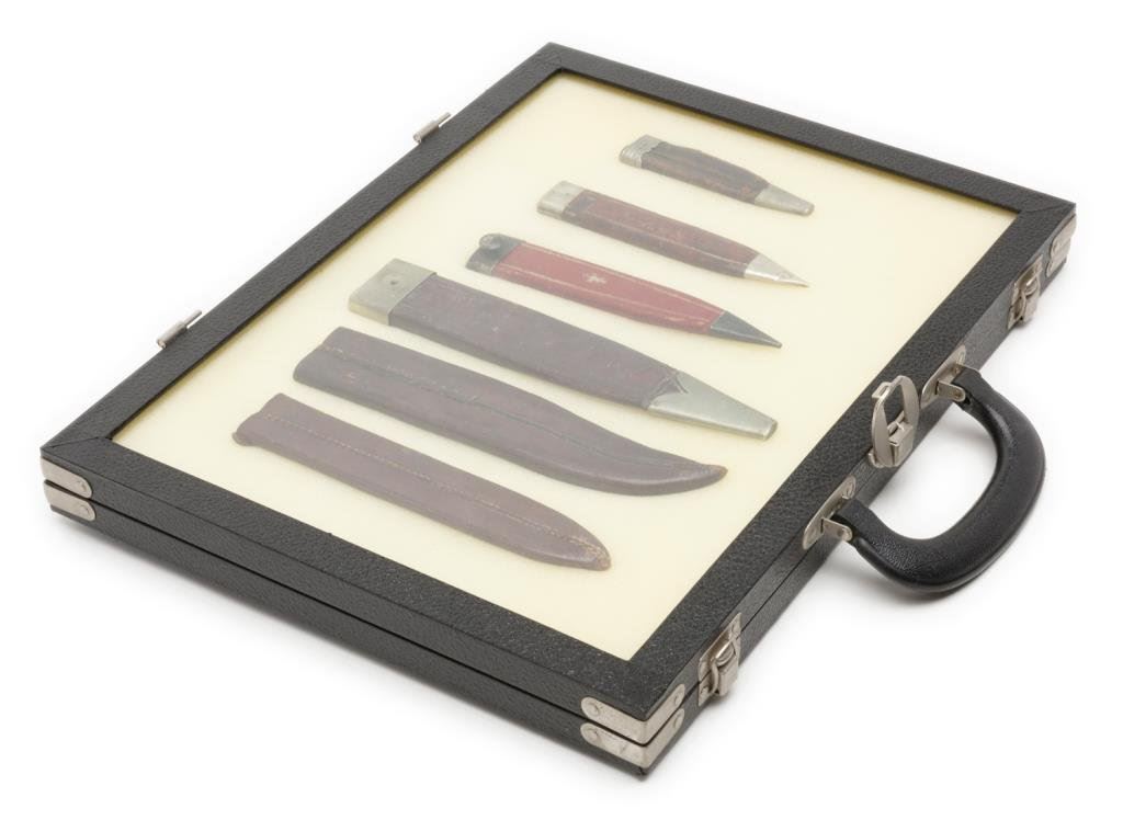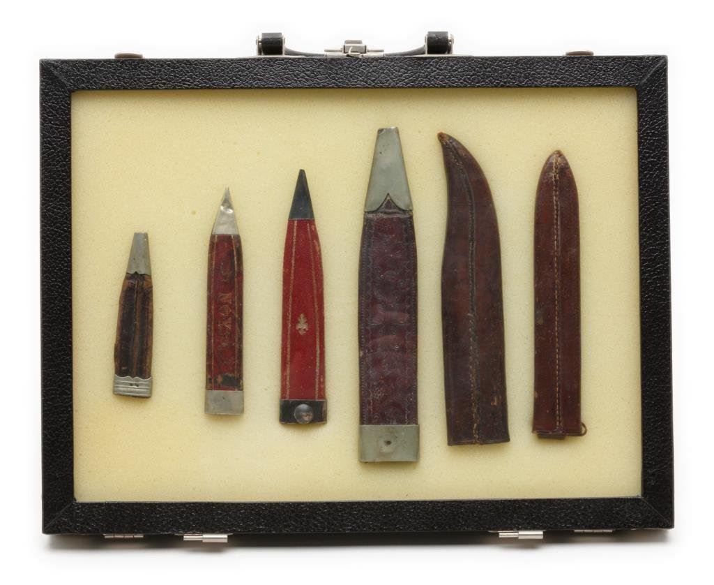 Lot of 6 antique knife sheaths varying in size from approximately 8.5” to 4” in overall length, all in good to very good condition and ca 1850’s to 1900. A neat lot for the knife collector with prized early knives that are missing a sheath. Est.: $100-$175.