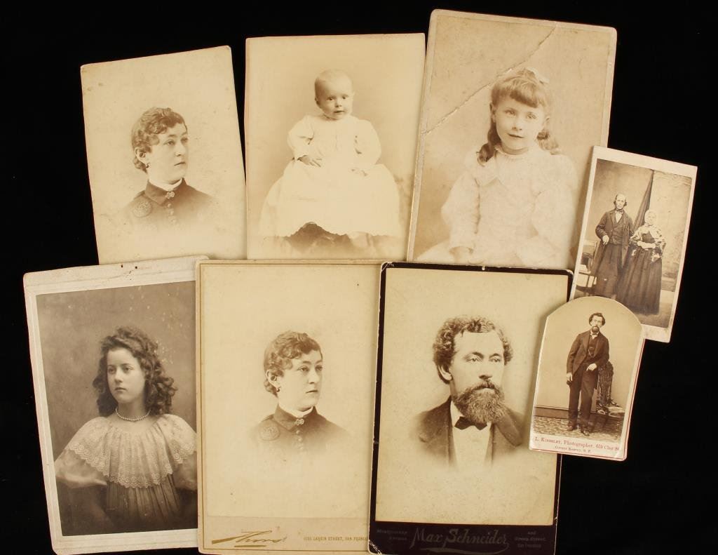 Lot of 6 cabinet photos and 2 CDVs; all appear to be from the Cahill and Haslam family of San Francisco, California given penciled notes on the back of some of the photos; would be interesting to further research. Est.: $25-$50.
