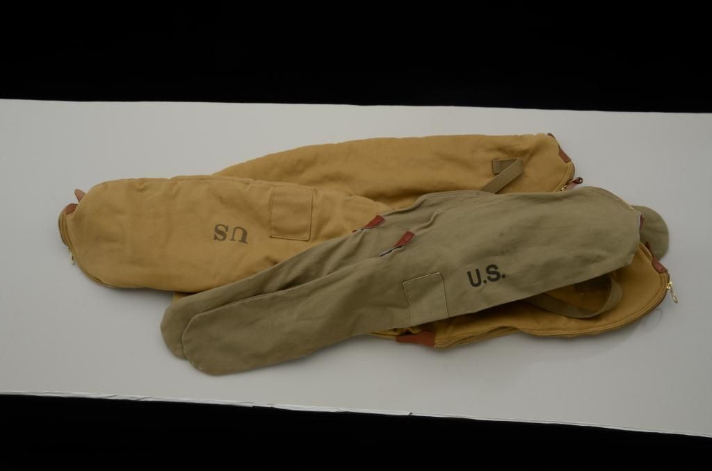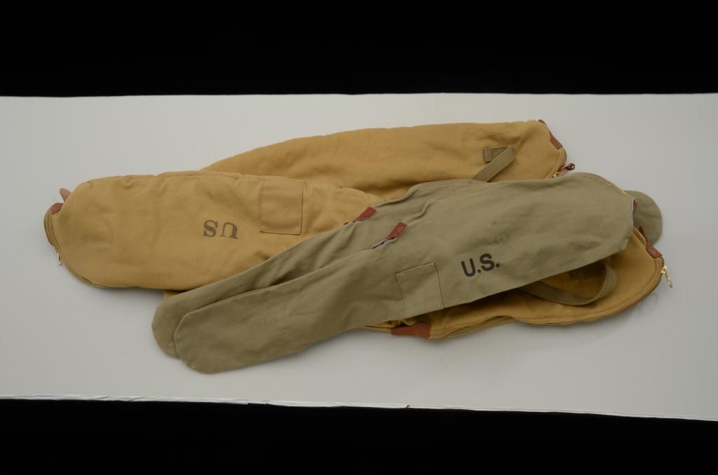Lot of 6 canvas covers for M1 carbines, three in olive green color with adjustable woven slings, all marked in black “US” and three in light tan color, fleece lined with adjustable woven slings, also all marked inblack “US”; all 6 in very good condition. Est.: $50-$100.