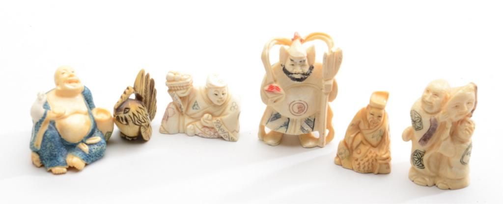 Lot of 6 carved ivory netsuke figurines including five different male figures and a bird; all in very good condition and nicely accomplished. Est.: $250-$500.