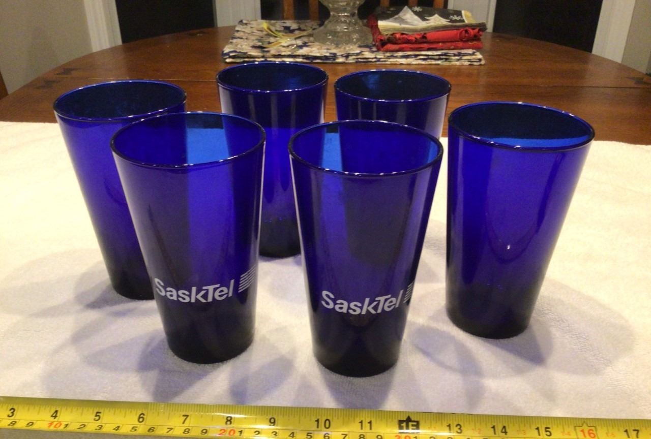 Lot of 6 cobalt blue 6" glasses. Two with SaskTel logos.