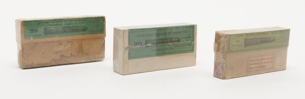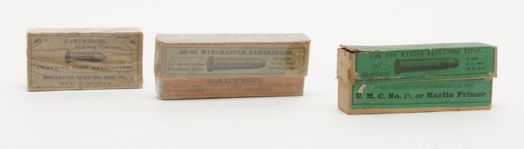 Lot of 6 collector’s boxes of ammunition including a box of Winchester green label .45-70-500 Extra Heavy Solid Head; a U.M.C green label .38-70-255 box marked “REPACKED”; a Winchester box with green label of .40-70 cartridges marked “FOR SHARPRIFLE”; a box containing 13 rounds of .40-60 cartridges with green and orange label box by Winchester; a green label U.M.C. box for .40-60 Marlin Repeating Rifle cartridges containing 7 brass cases only and a Winchester box marked .44S&W AM. Noted to contain “15 original factory loaded rounds”; missing 1-1/2” sides of the lid. Est.: $200-$400.