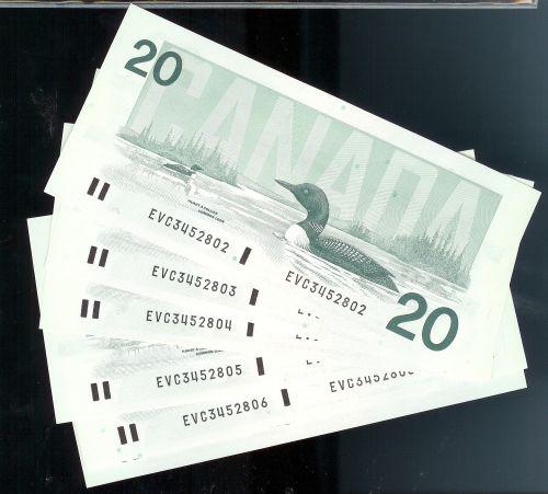 Lot of 6 consecutive notes. BC-58b 1991 $20 EVC3452802 to 2807 with BACK PLATE. All GEMS!