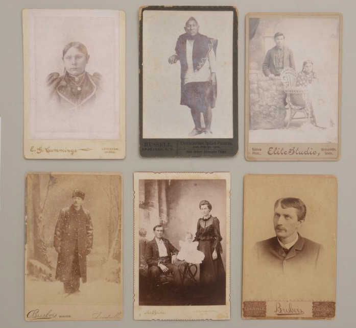 Lot of 6 desirable original early cabinet photos including three of early American Indians, two from Idaho (Grangeville and Lewiston) and one from Anadarko, O.T.; another family photo from Lexington, O.T. and two Brisbois photos (Leadville, Colorado) one of a man in snow, the other a simple portrait. Est.: $100-$200.