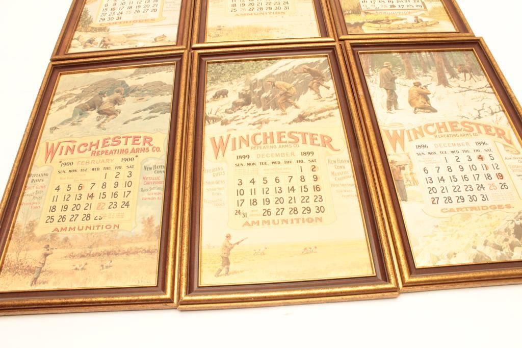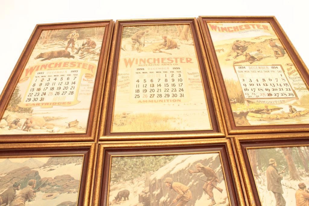 Lot of 6 framed reproductions of early Winchester Repeating Arms Co. color calendar advertisers; each approximately 17” x 10”. Est.: $50-$100.
